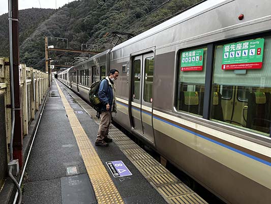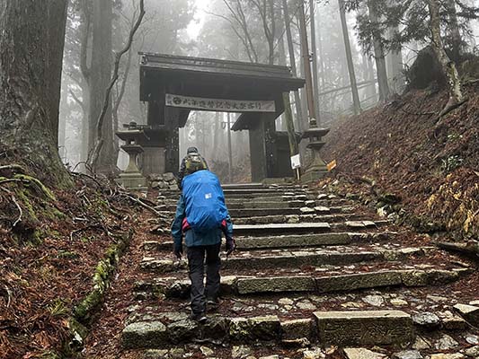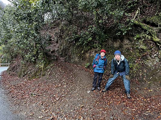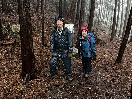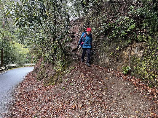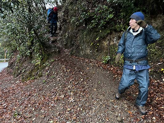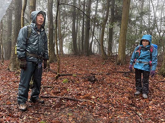 保津峡駅に降り立ったマウンテンサポートやまやのメンバー、この時点では雨は降っていなくて、尾根の突端から急な岩道を登ります。