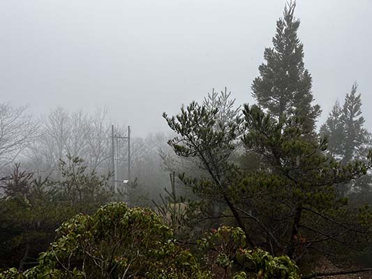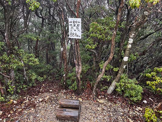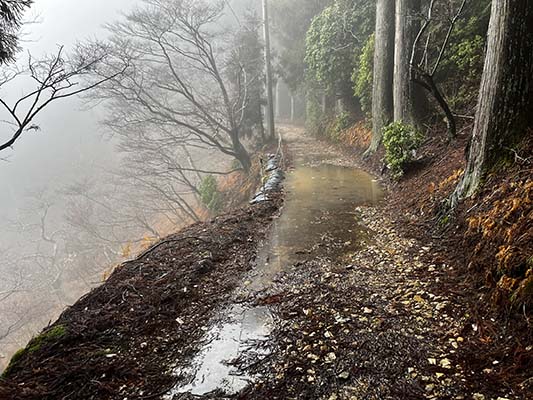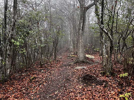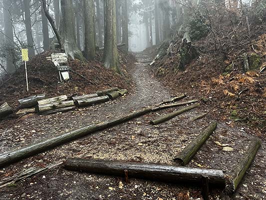 その後はダラダラとしたなだらかな尾根道に変わりますが、時折木々の間から姿を見せる愛宕山…と思いきや、上部はガスがかかり真っ白状態。「何も見えねー!」
