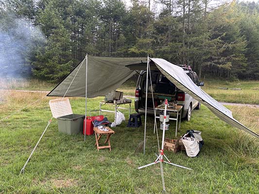 車も昔使っていたタープをそれ用にアレンジし、万が一の雨にも備えます。